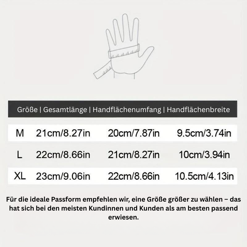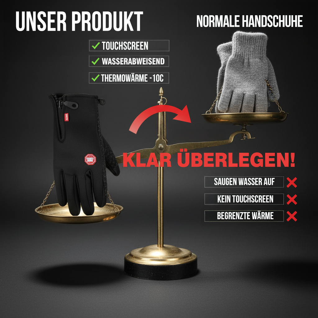 Normale Handschuhe halten nur kurz warm bis Wind und Nässe durchdringen oder du sie fürs Handy ausziehen musst. Unsere Thermohandschuhe sind anders: Sie speichern Wärme, halten Schnee und Regen fern und lassen dich dank Touchscreen-Funktion verbunden bleiben. Für warme, geschützte Hände und das gute Gefühl, dem Winter gelassen zu begegnen.